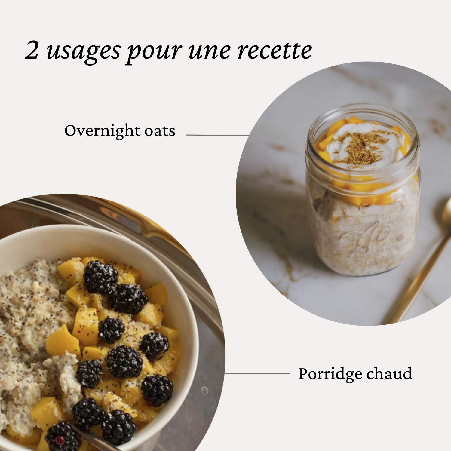 - Méthode Express : Versez la préparation dans un bol, ajoutez le liquide de votre choix (lait ou lait végétal) et réchauffez 2min au micro-ondes à 180°.
