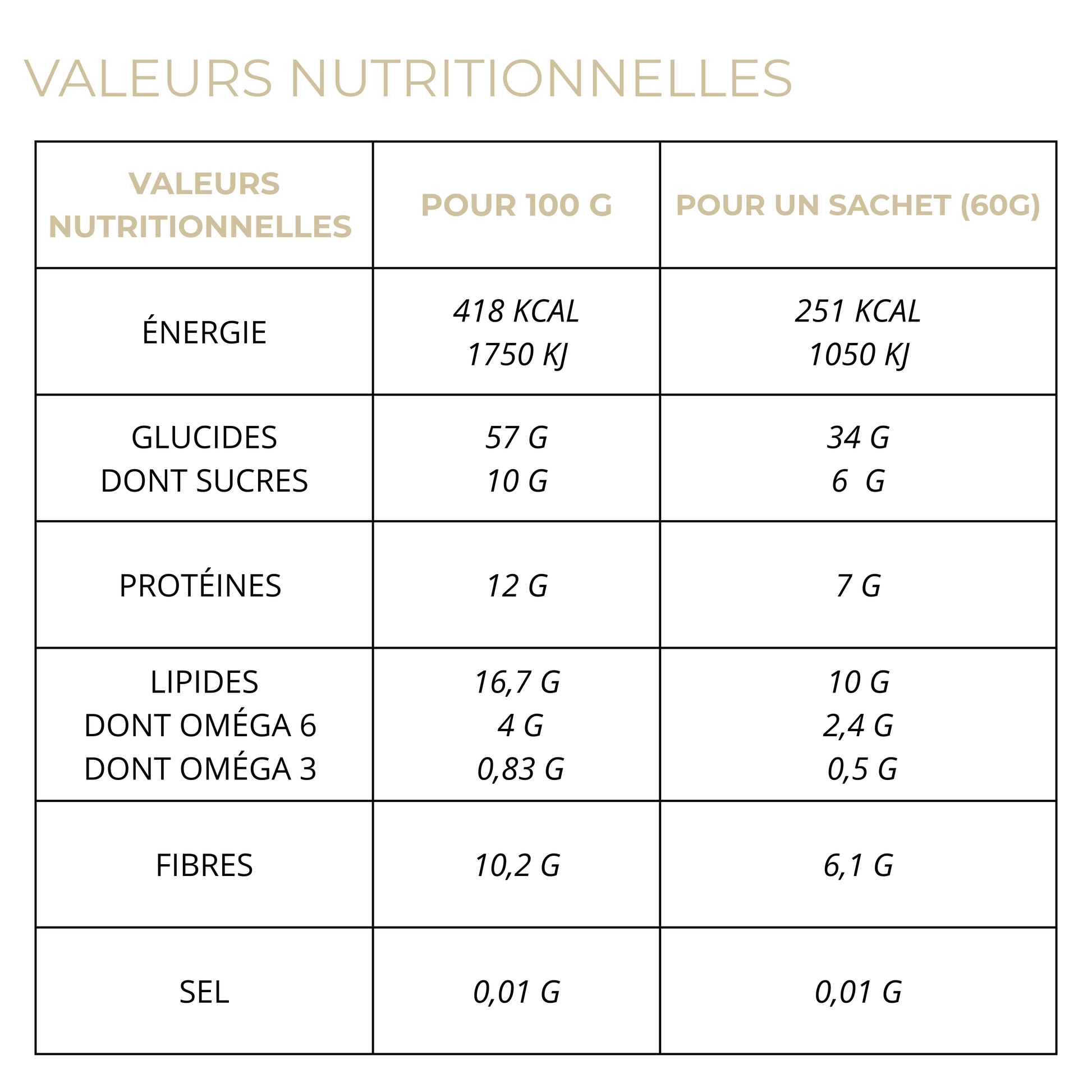 • Source de protéines végétales : 7 g pour une portion de 60 g
